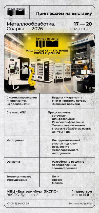 Приглашаем Вас посетить стенд ООО «Точные машины»: № 1E11 в рамках выставки «Металлообработка. Сварка», которая пройдет 17-20 марта 2026 г. в г. Екатеринбург, «Екатеринбург ЭКСПО»