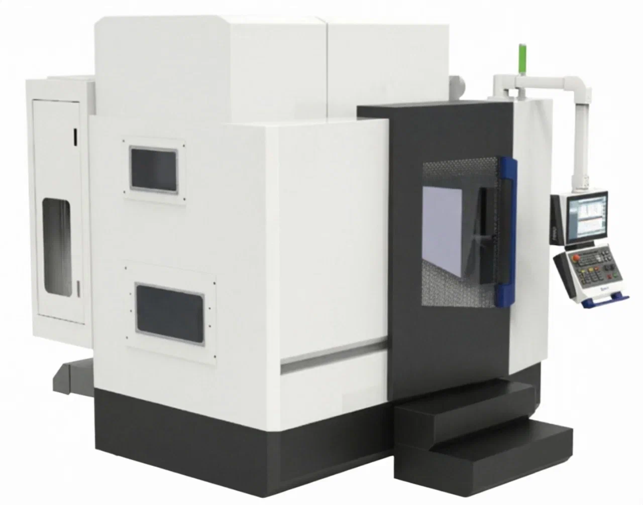Пятиосевой вертикальный обрабатывающий центр построен на базе массивной С-образной станины, основные узлы которой отлиты из высокопрочного чугуна QT550, что гарантирует высокую жесткость и полное отсутствие вибраций при интенсивной высокоскоростной обработке. Кинематическая схема включает одноплечую качающуюся головку по оси B в сочетании с поворотным столом по оси A, что делает станок оптимальным для обработки сложных деталей типа валов, дисков и корпусных элементов. Прецизионная механика базируется на шарико-винтовых передачах NSK/THK, роликовых направляющих и линейных энкодерах Heidenhain, формируя полнозамкнутый контур обратной связи для долгосрочного сохранения точности. В стандартную комплектацию входит поворотный стол с прямым приводом и подшипниками YRT повышенной грузоподъемности, а также электрошпиндель с интерфейсом HSK-A63. Доступна кастомизация шпинделя со скоростью вращения до 42 000 об/мин, мощностью до 40 кВт и крутящим моментом 73,8/96,1 Н·м (пиковый до 120/155 Н·м). Управление осуществляется через современные системы ЧПУ Siemens, Heidenhain или HNC.