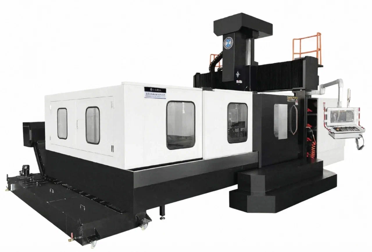 Портальный обрабатывающий центр с полностью закрытым контуром представляет собой тяжелое промышленное оборудование, предназначенное для высокоскоростной фрезерной обработки крупногабаритных деталей. Станок оснащен широкими закаленными направляющими шириной 130 мм по оси Z, что является максимальным показателем среди аналогичных портальных станков и обеспечивает повышенную износостойкость и исключительную жесткость конструкции. Основные узлы выполнены с применением прецизионных шарико-винтовых передач диаметром 80/50/50 мм и направляющих типа Hard Track 65, что гарантирует высокую точность и стабильность при интенсивных нагрузках. В стандартную комплектацию входит шпиндель с конусом BT50 (опционально доступен HSK63A), двигатель мощностью 18,5 кВт и максимальной скоростью вращения 6000/18000 об/мин, а также система охлаждения шпинделя, устройство удаления стружки и насос высокого давления.