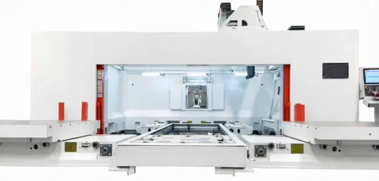 Станок обладает рабочим столом размером 4000*2000 мм с ходами по линейным осям X/Y/Z 4000/2500/1000 мм и поворотными осями A/C в диапазонах 110 и 360, позволяя выполнять комплексную пятиосевую обработку крупногабаритных деталей сложной пространственной формы. Высокопроизводительный шпиндель развивает мощность 80 кВт (S1), крутящий момент 80 Нм и максимальную частоту вращения 24 000 об/мин, а скорость ускоренных перемещений достигает 50 м/мин, обеспечивая высокую динамику и стабильную точность позиционирования. Система автоматической смены рабочих столов выводит загрузочно-разгрузочные операции за пределы рабочей зоны, минимизируя непроизводительные простои и позволяя организовать непрерывное поточное производство. Станок успешно применяется в аэрокосмической, автомобильной и энергетической отраслях для высокоточной обработки алюминиевых и титановых сплавов, конструкционных сталей и современных полимерных композитов в полностью автономном и экологически безопасном режиме.